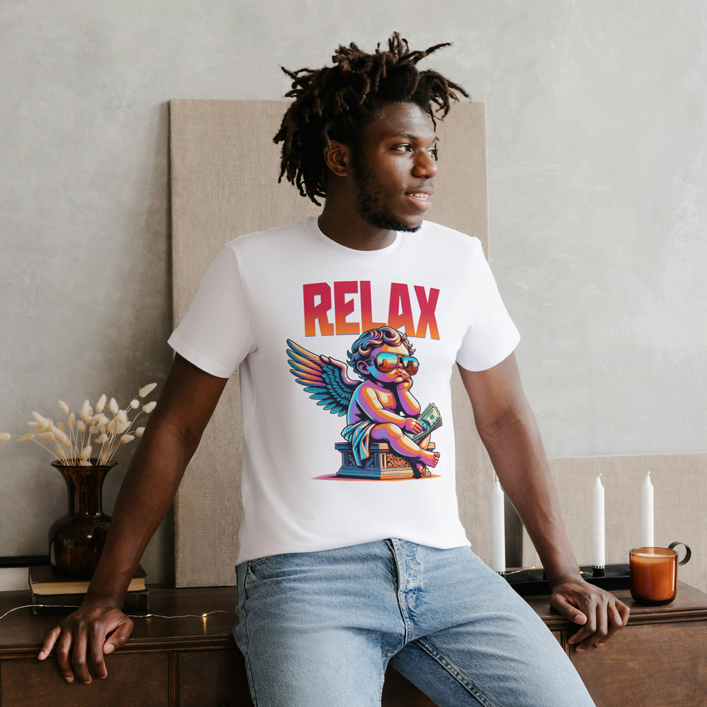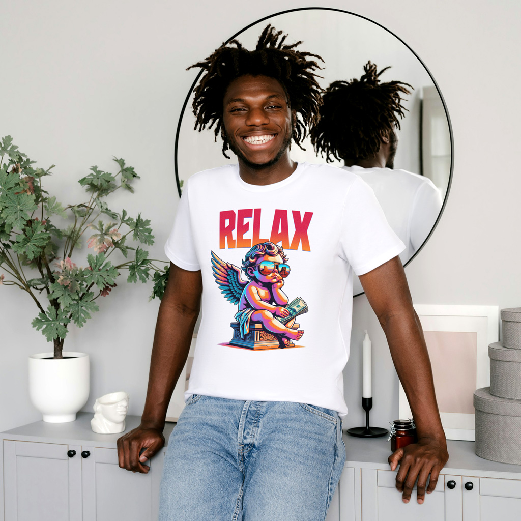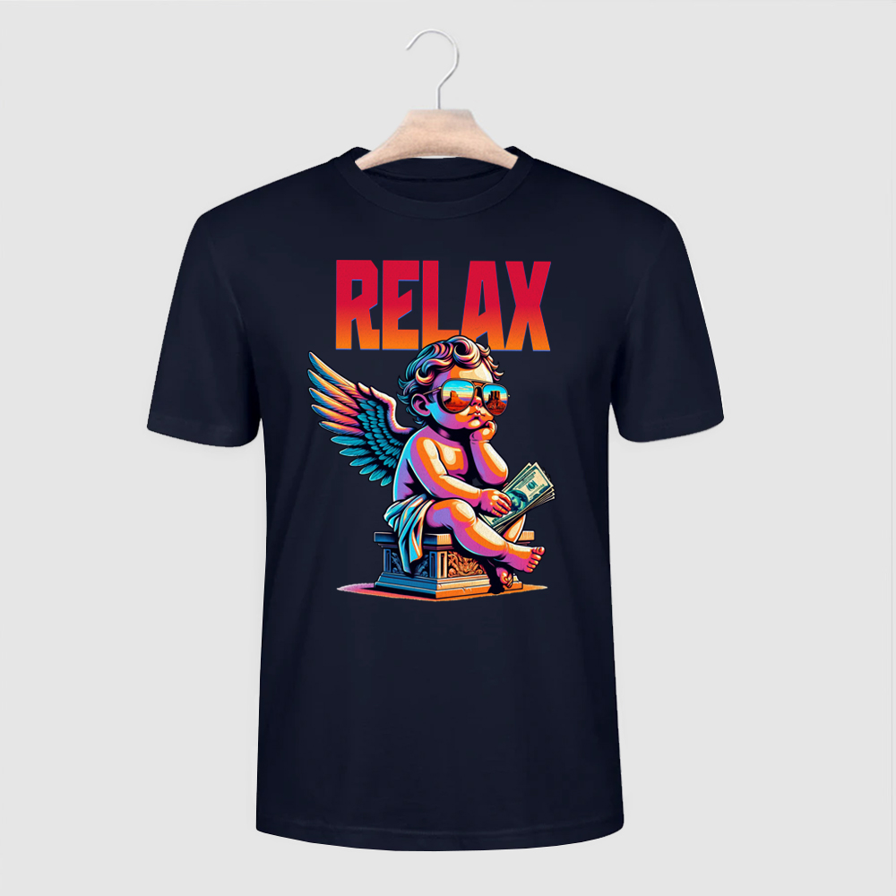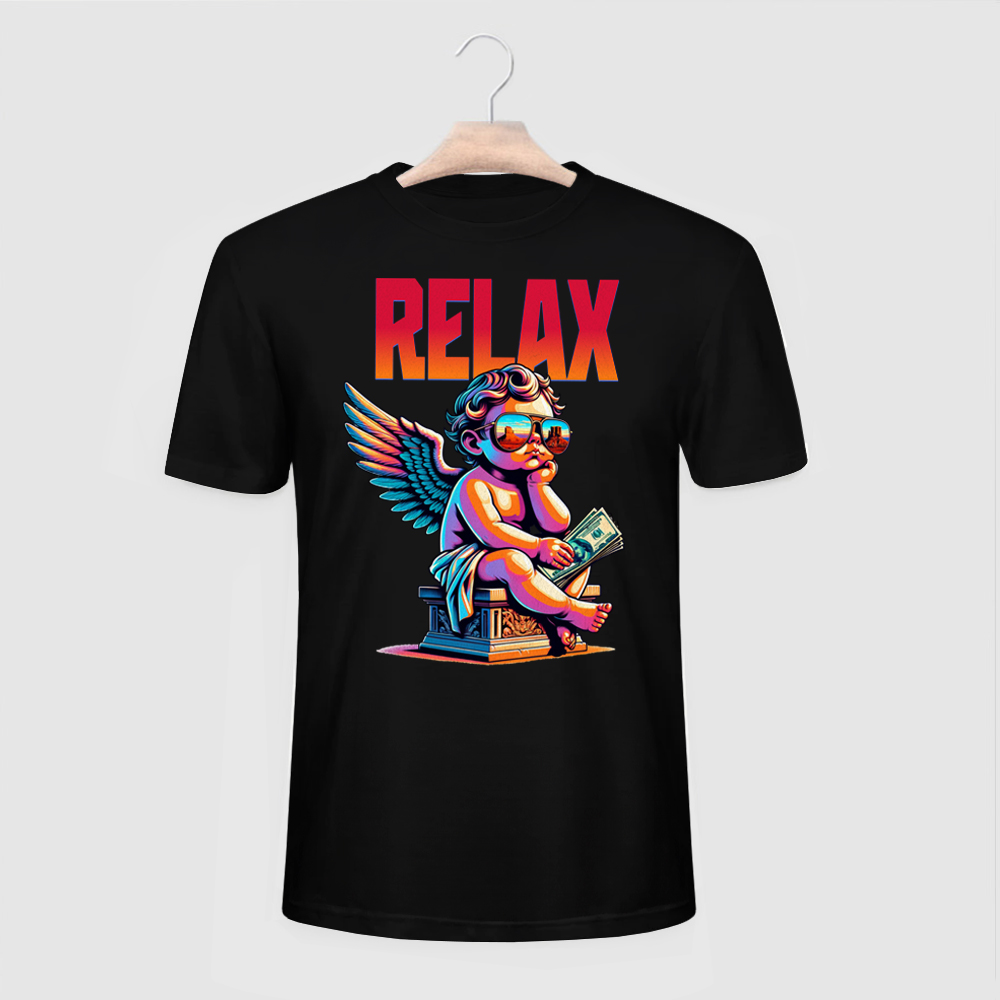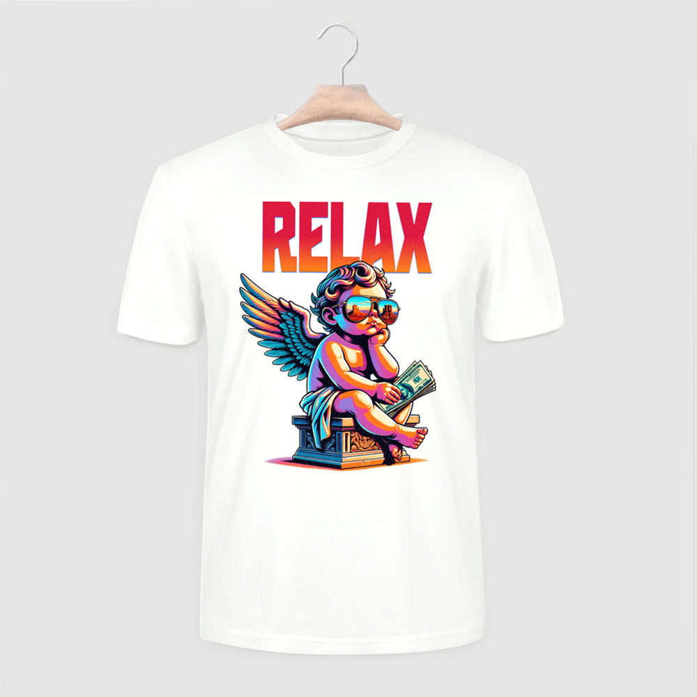 - Print: A bold, colorful design featuring an angel with sunglasses and money, an unusual mix of classic imagery, irony, and urban style.