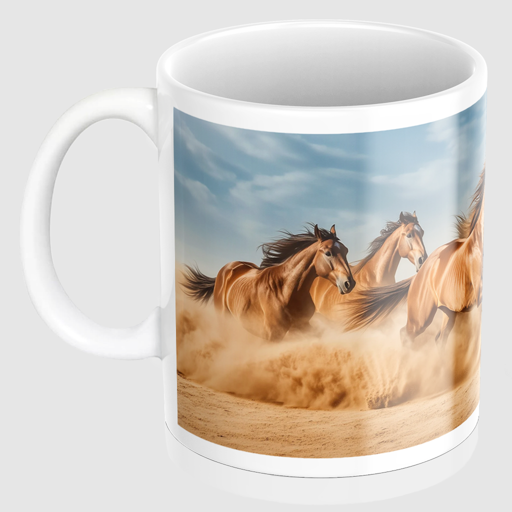 Poczuj energię i majestat galopujących koni dzięki kubkowi z wyjątkową grafiką przedstawiającą dynamiczną scenę na tle pustynnego krajobrazu. To nie tylko praktyczne akcesorium, ale także doskonały sposób na wprowadzenie pasji i piękna natury do swojej codzienności.