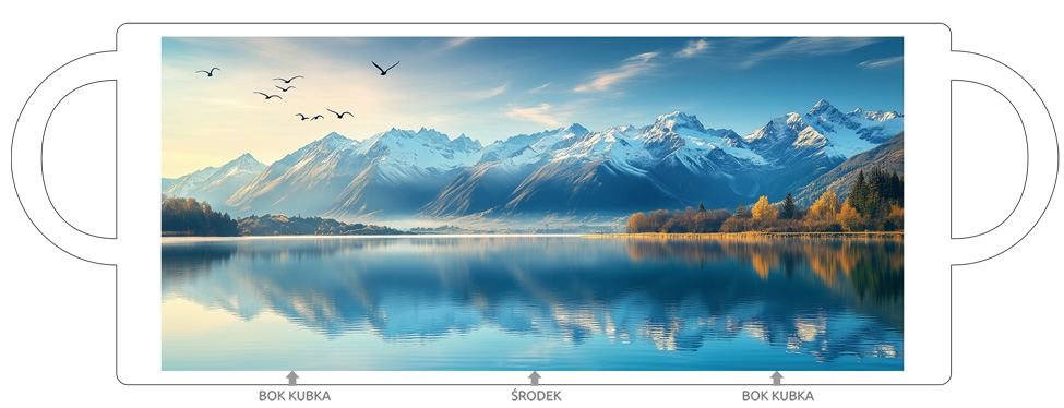 Kubek ceramiczny z grafiką jeziora i gór. Pojemność: 330 ml, biały. Trwały nadruk w technologii CMYK. Nadaje się do mycia w zmywarce (do 65°C) i używania w mikrofalówce. Idealny dla miłośników natury i spokoju.