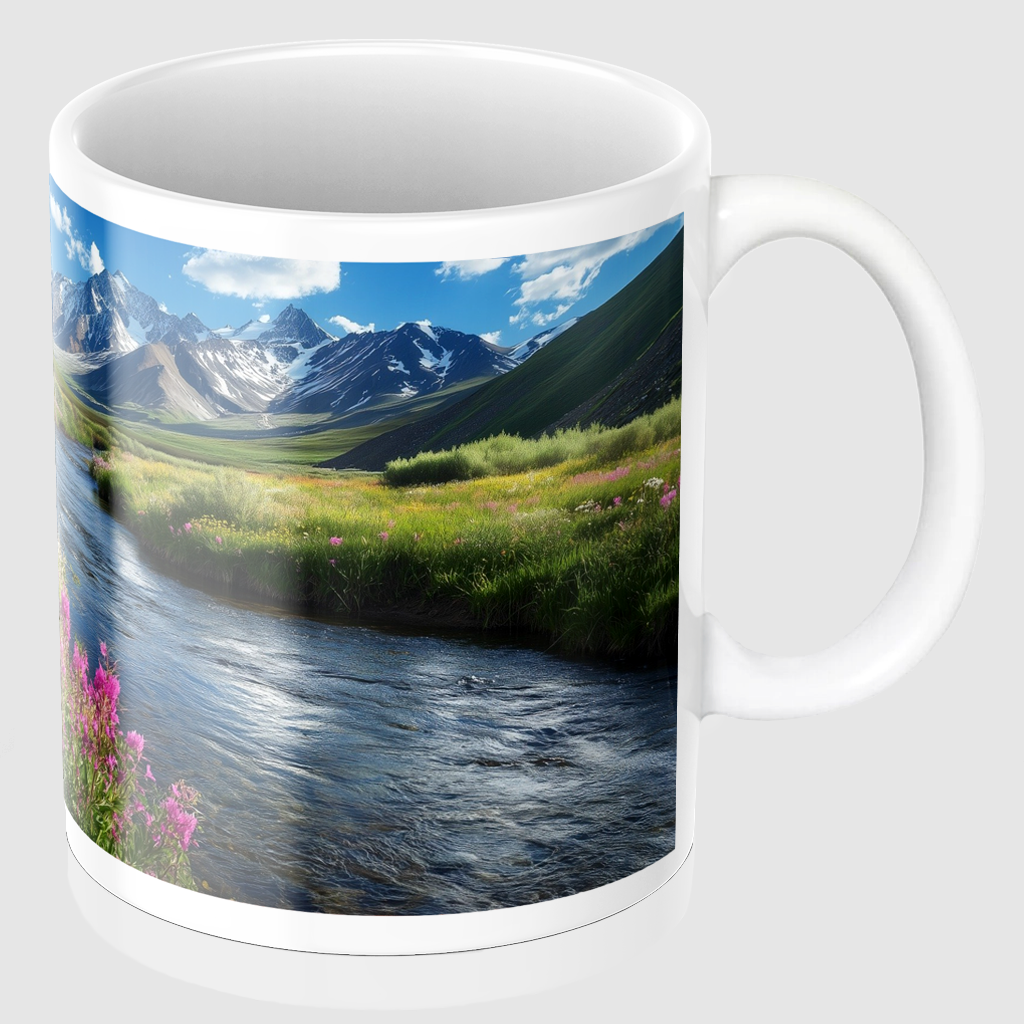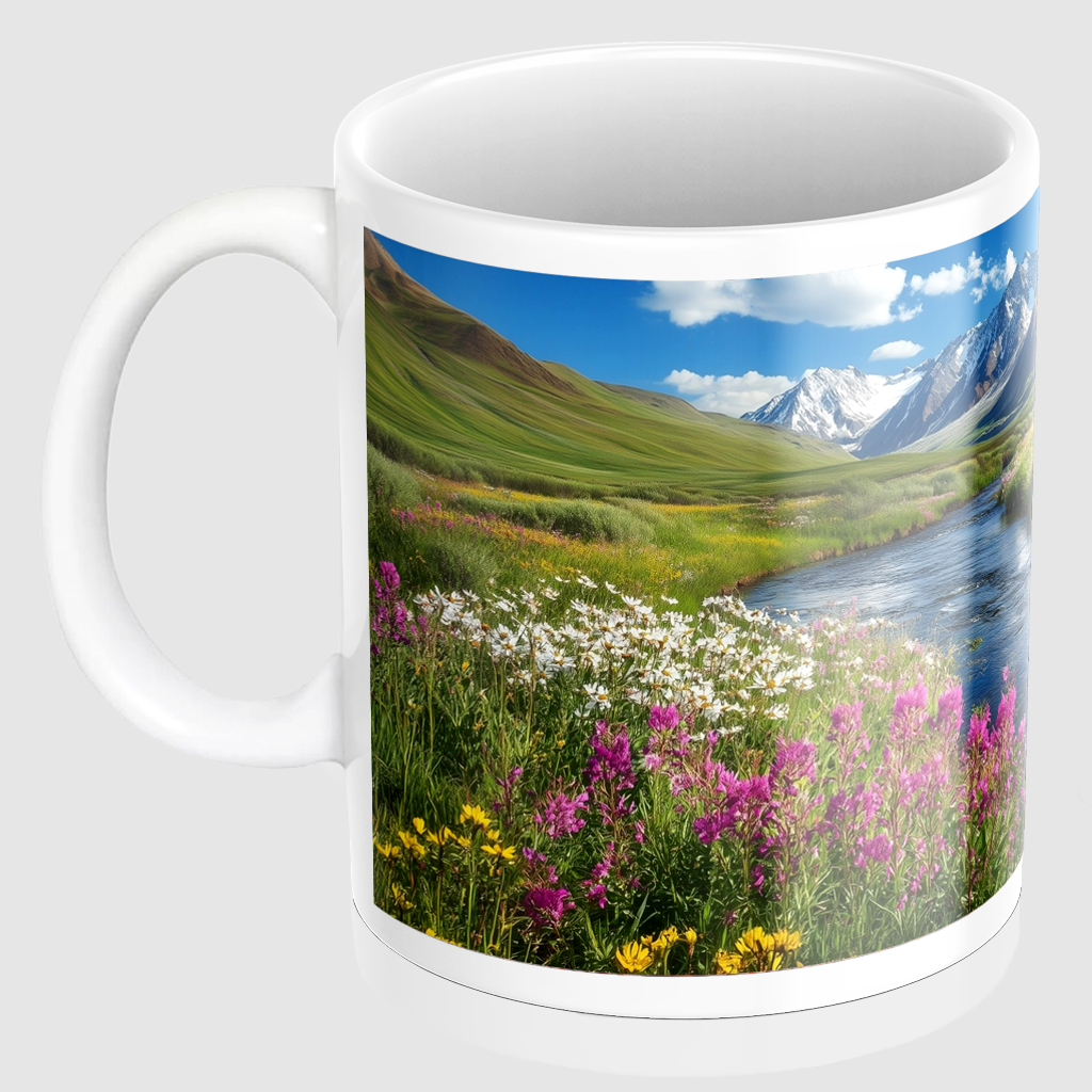 Zrelaksuj się przy filiżance ulubionego napoju w towarzystwie malowniczego górskiego strumyka, otoczonego polami pełnymi kwiatów i ośnieżonymi szczytami. Ten kubek to nie tylko praktyczne akcesorium, ale także sposób na wprowadzenie piękna natury do codziennych rytuałów.