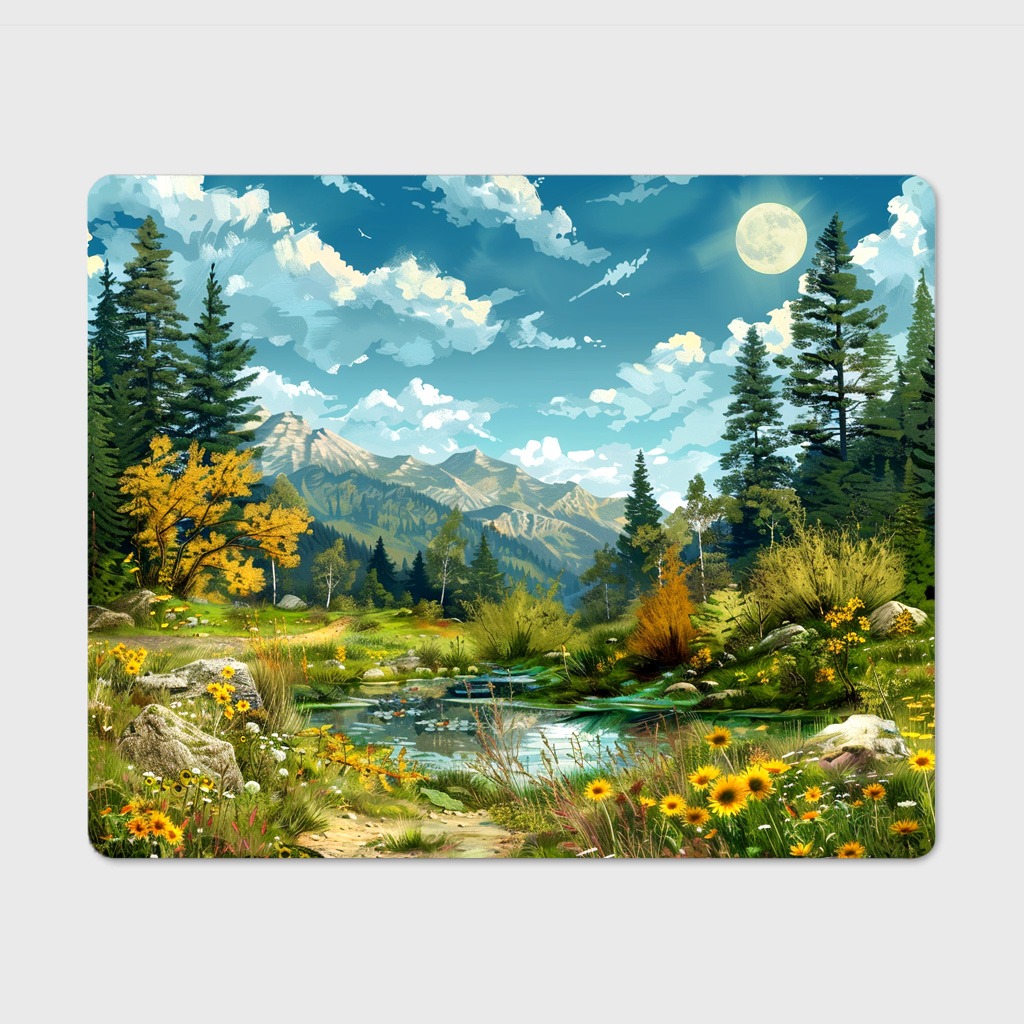 Ożyw swoje biurko malowniczym widokiem jeziora otoczonego górami i bujną roślinnością. Podkładka o wymiarach 18 × 22 cm to praktyczny dodatek, który łączy funkcjonalność z pięknym designem.