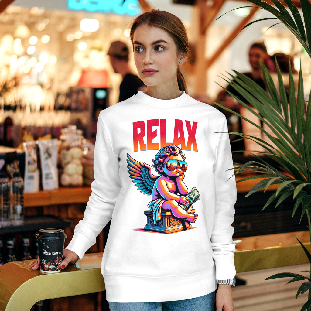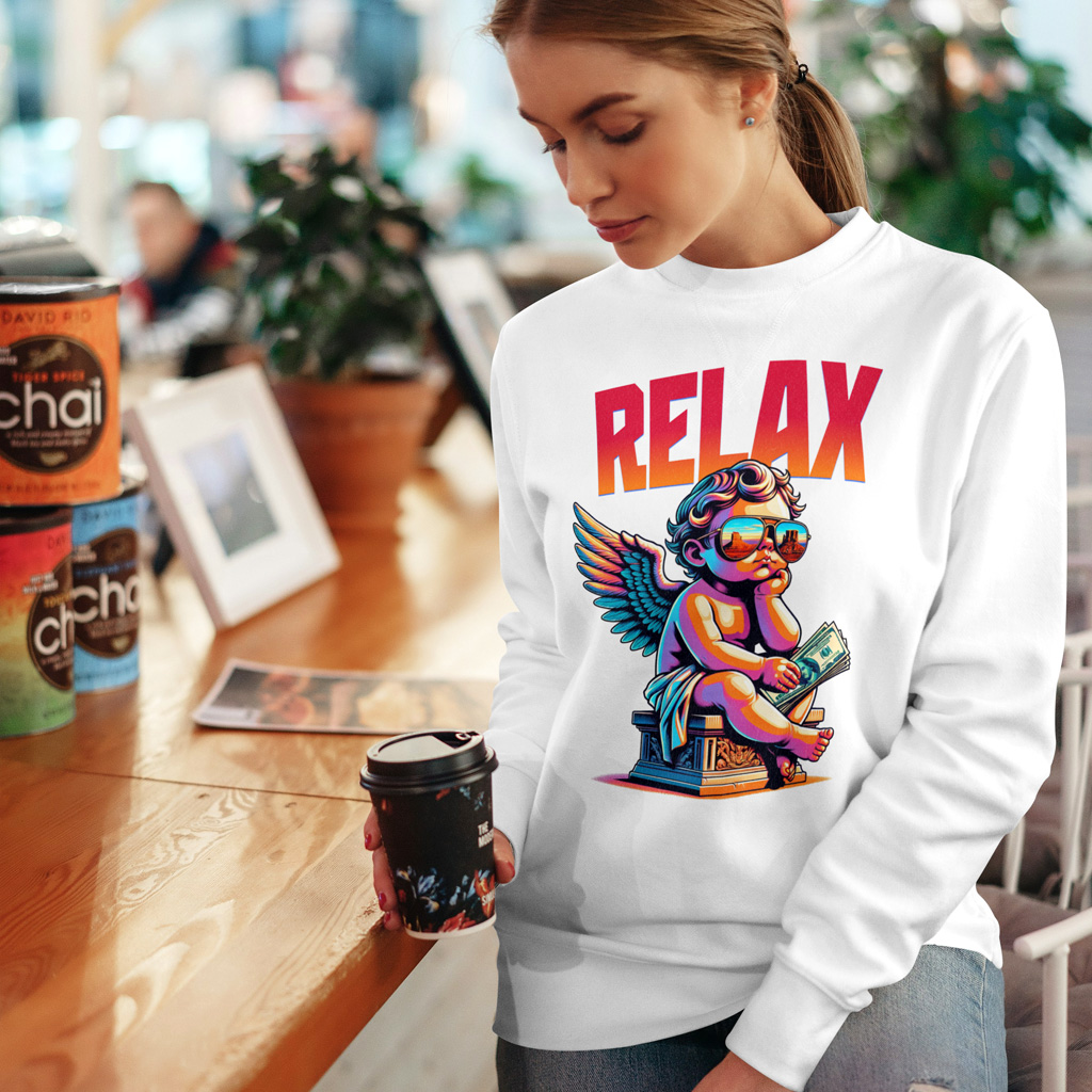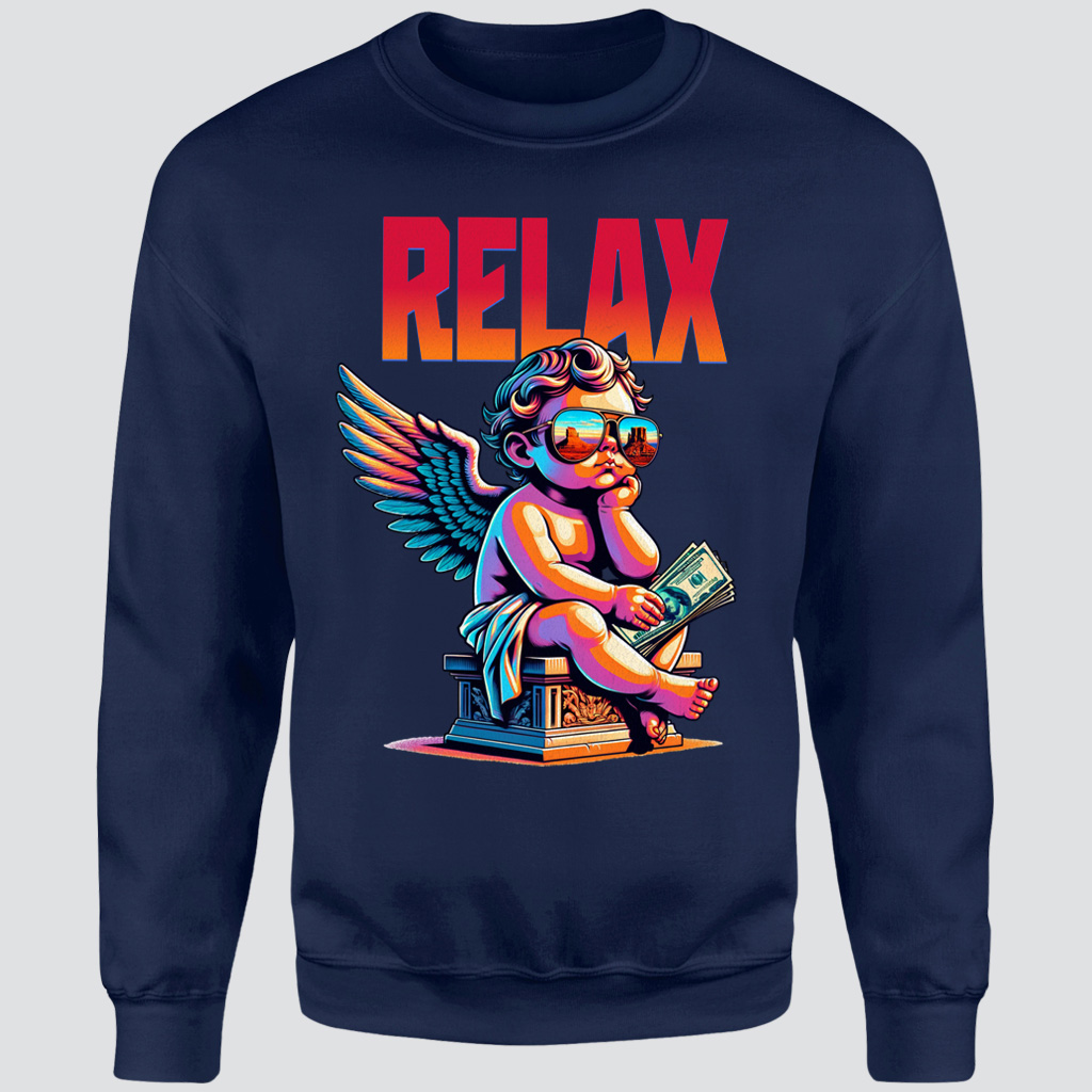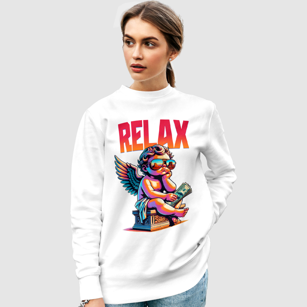 Odpocznij… ale z klasą. Bluza „RELAX” to odważne połączenie streetwearowej energii i artystycznej prowokacji. Kolorowy nadruk przedstawia wyluzowanego aniołka w okularach przeciwsłonecznych, z wachlarzem banknotów w dłoni – jakby właśnie zakończył swoje sprawy na Wall Street i przeszedł na tryb „nie obchodzi mnie nic”. To ironiczny komentarz do współczesnego stylu życia – z przymrużeniem oka, ale też z wyraźnym charakterem.