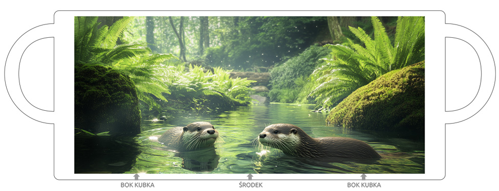 Dodaj do swojej codzienności kubek, który przenosi w świat spokojnych leśnych krajobrazów. Grafika przedstawiająca wydry pływające w krystalicznej wodzie, otoczonej bujną zielenią, wprowadza harmonię i świeżość do każdego poranka.