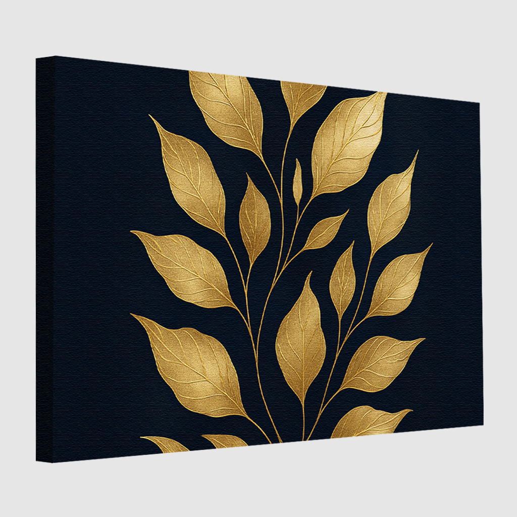 Obraz na płótnie ze złotymi liśćmi na granatowym tle – luksusowy i stylowy akcent dekoracyjny.